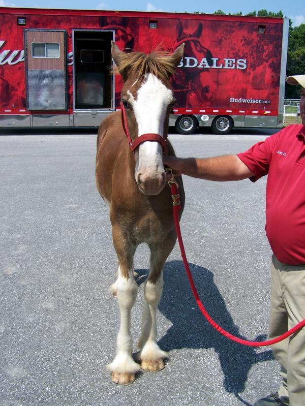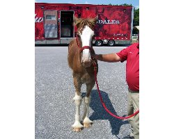 [ Color: Bay ] ] [ White Markings: Light bay, face and legs white, right side of blaze has a thin white strip that doesn't connect with big bay spot inside, white flecks on both sides of belly with larger white spot on right girth, both nostrils and muzzle white. ]