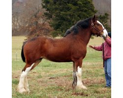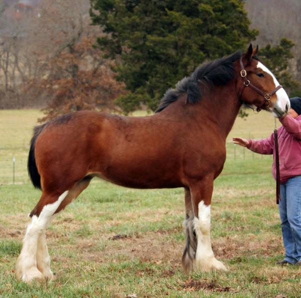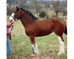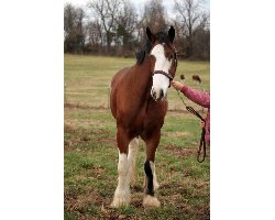 [ Color: Bay ] ] [ White Markings: Dark bay, right foreleg white to above knees, left foreleg mixed, hind legs white to hocks and extending onto gaskins, face white extending over muzzle on right side to underjaw and over cheek on left side to underjaw, black on upper and lower lips. ]
