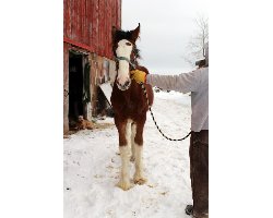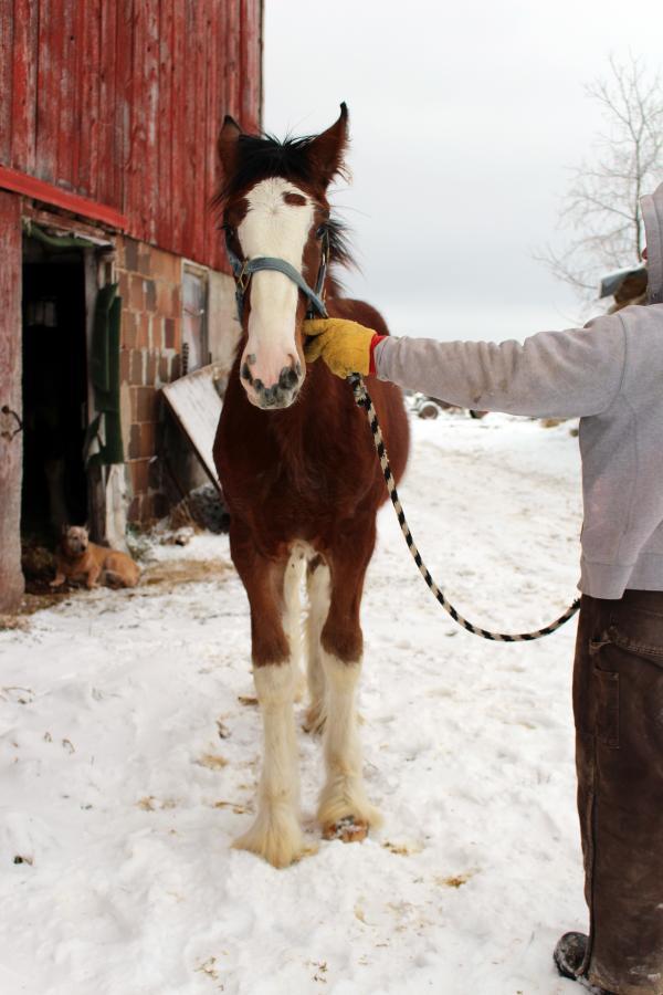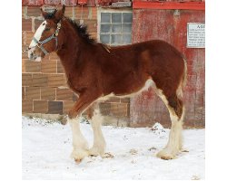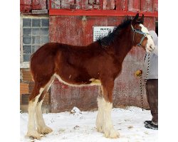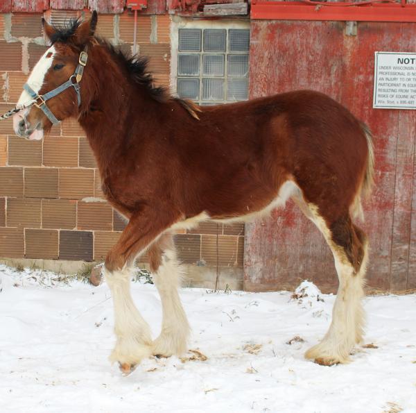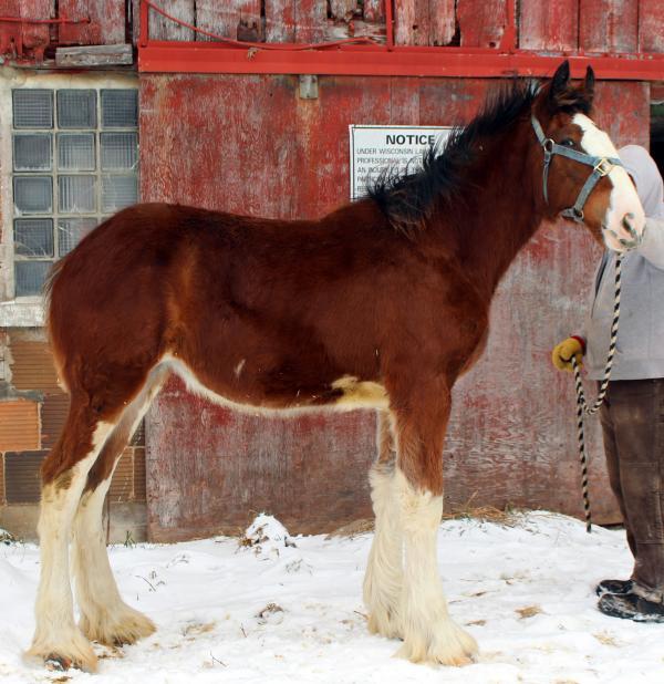 [ Color: Bay ] ] [ White Markings: Bay, face white extending over muzzle on right side to complete chin, dark spot to inside of left eye, small white spot in front of right flank, white spot behind left elbow, forelegs white to knees, hind legs white to hocks. ]