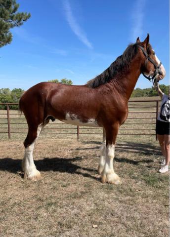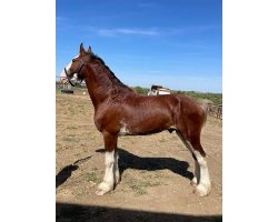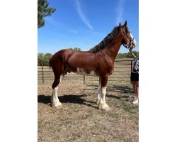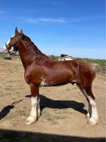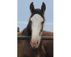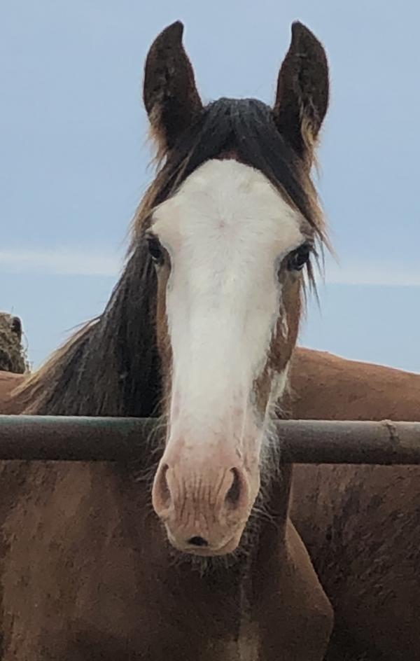 [ Color: Light Bay ] ] [ White Markings: Light bay with white above knees and hocks. Wide blaze extending over eyes, through nose and bottom lip up chin, some white into cheek more on left side. Spot in middle of nose by lip. White on belly, extending on lower belly on both sides ]