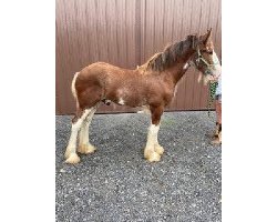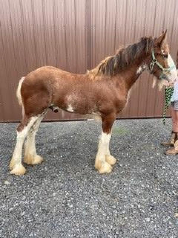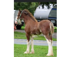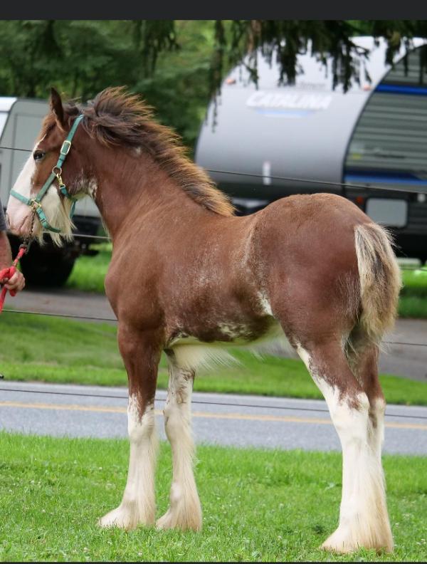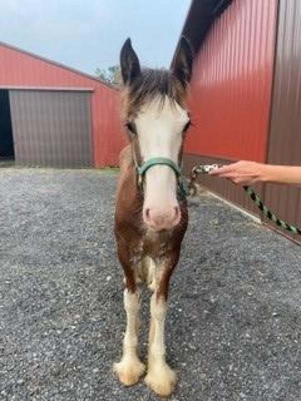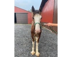 [ Color: Bay ] ] [ White Markings: Bay, full blaze extending to left eye, covering full muzzle and under chin on left side, white spot over right eye, white spots on underside of neck, white whorls on both sides of neck at mane, white hairs throughout body, front legs white above knees, rear legs white above hocks on front side, white stopping at hocks on back side, belly patch on right side ]